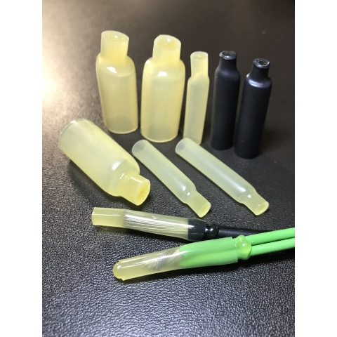 電線接続端部に使用し、(極めて強力な)特殊ホットメルト接着剤を内蔵しています。被覆後は芯線に浸透する効果があります。